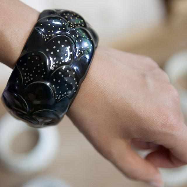 リングのカラーは肌馴染みのいいグレーがベース。1枚1枚のうろこにあわせて、シルバーでさりげなく模様が描かれています。磁器ならではの艶とシルバーの輝きの両方が、絶妙なバランスで配された都会的でハイセンスな逸品です。カッコよくも、女性らしくも、どちらのスタイルにもあわせやすいのが魅力。