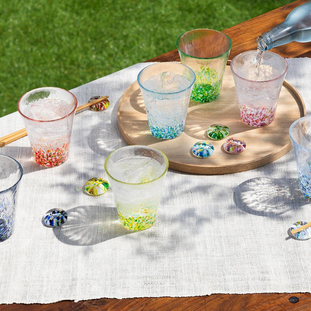 手に収まるやわらかな形で使い勝手がよく、氷越しに揺れる色が涼を添え、四季の景色が一杯の時間を小さな旅へと誘います。