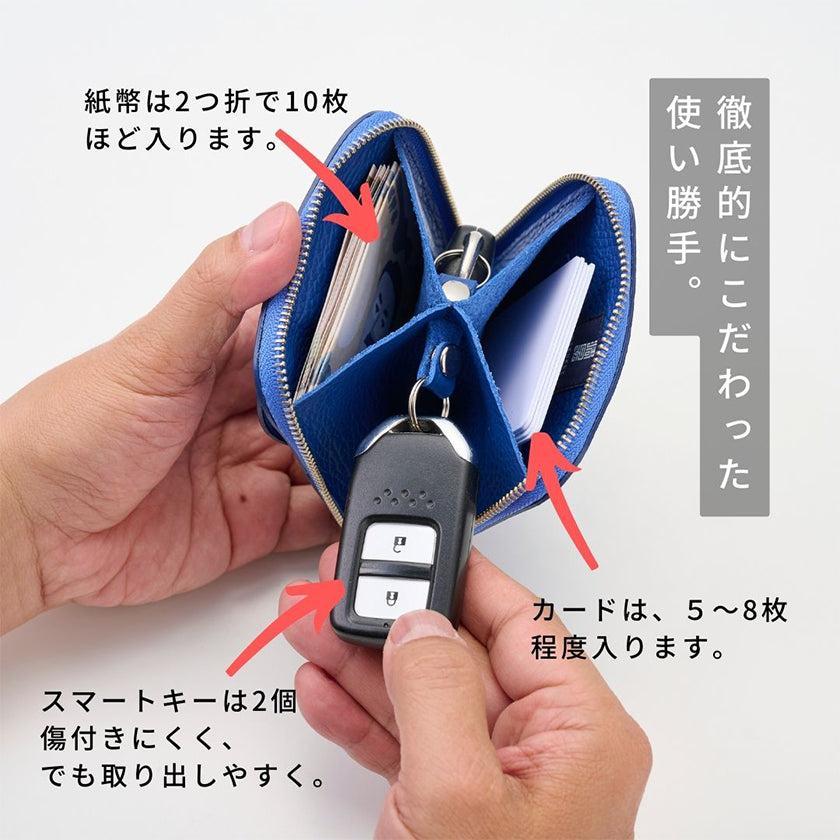 10cm四方の小サイズですが、スマートキー2個、アナログキー3本、カード類7枚、お札、小銭、、、その収納力は侮れません。