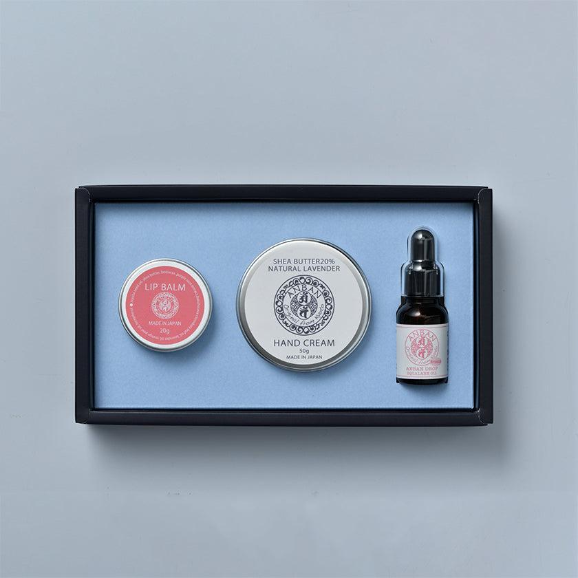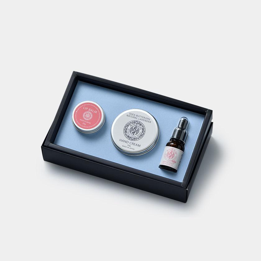 リップバーム・ハンドクリーム・スクワランオイルの3点を、上品なギフトボックスに詰めてお届けします。