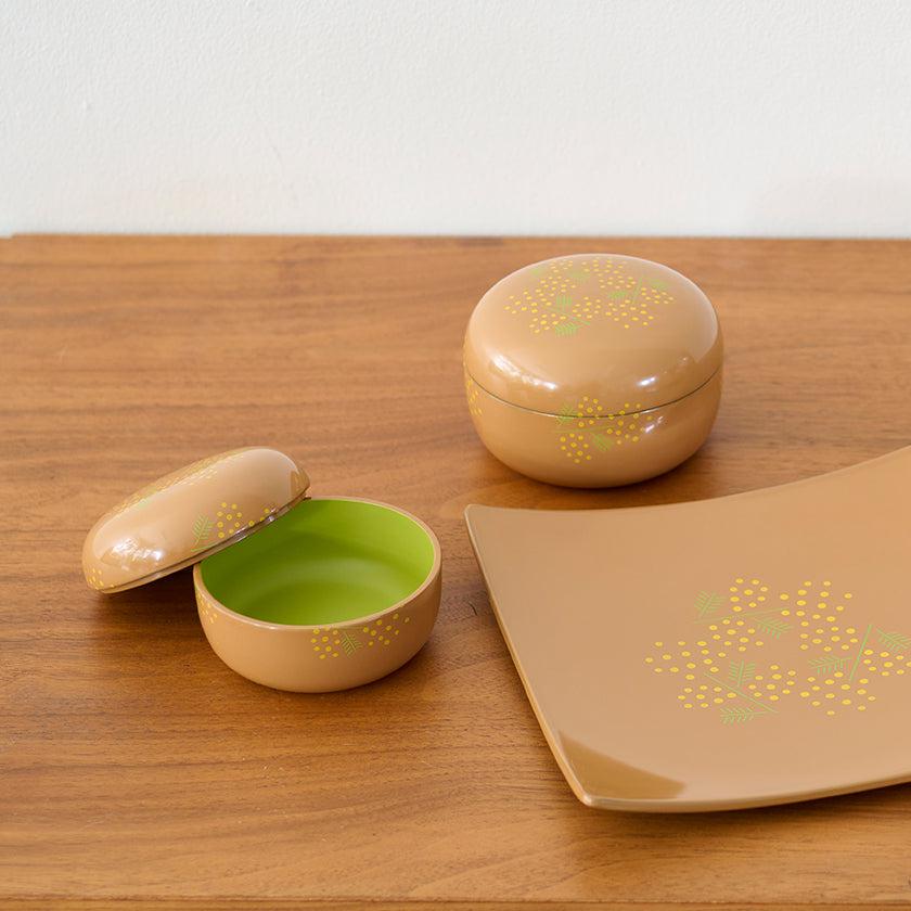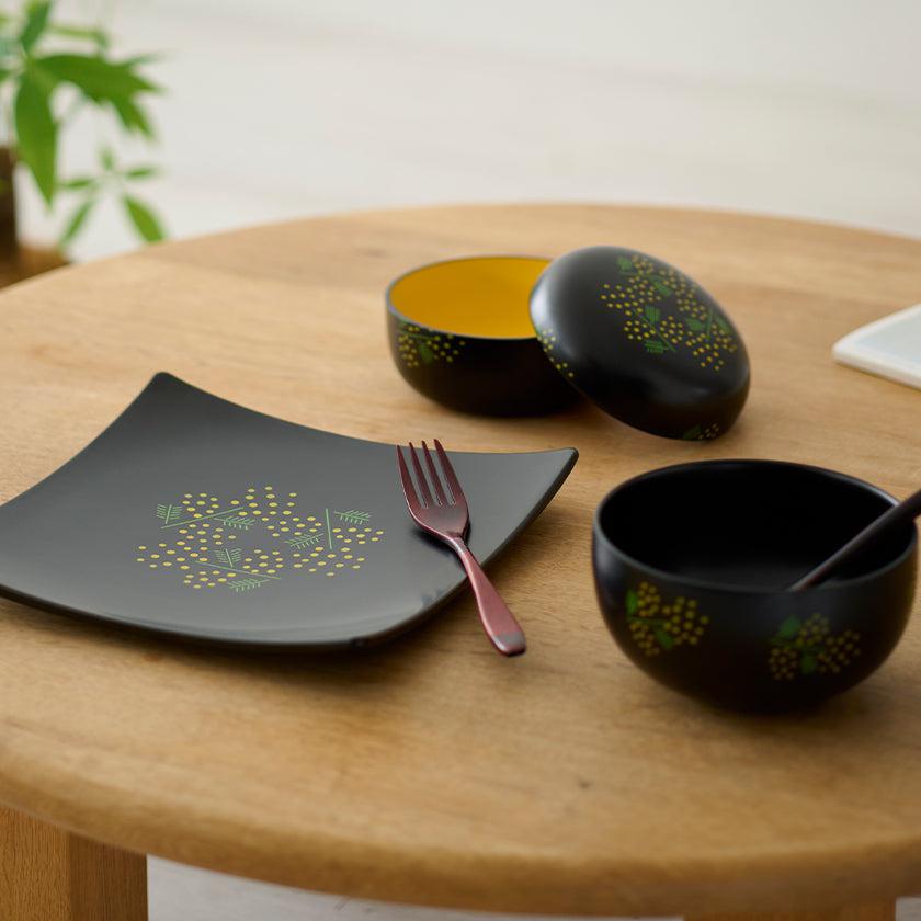 漆器にはめずらしいミモザの柄をモダンにデザインしました。