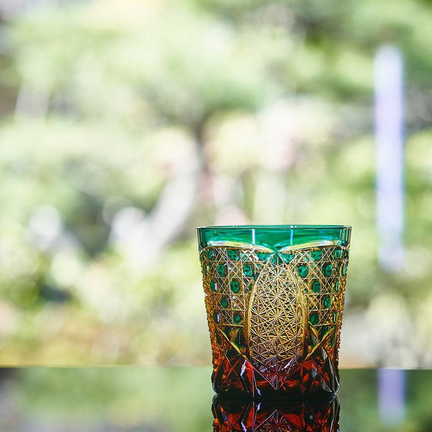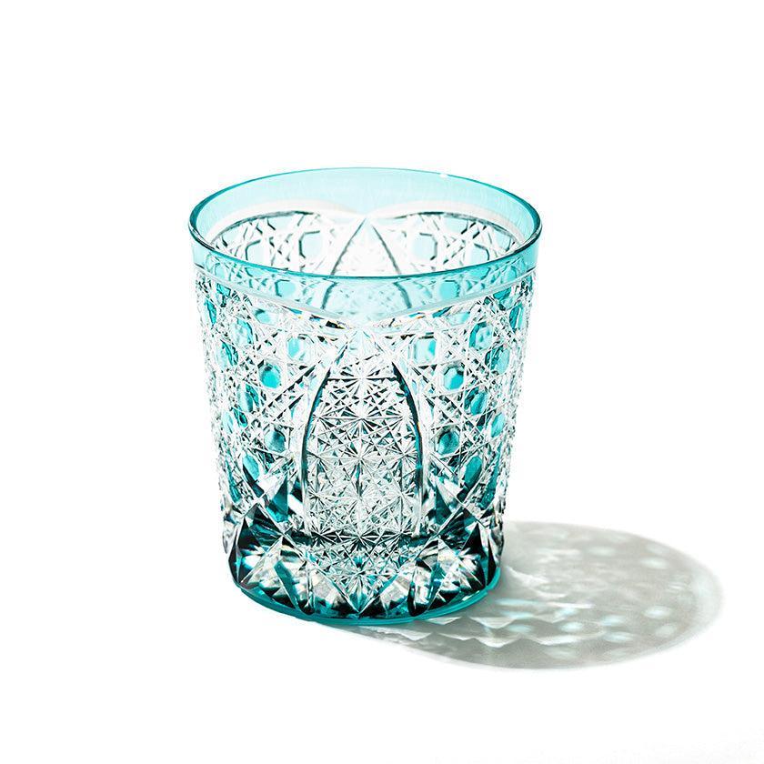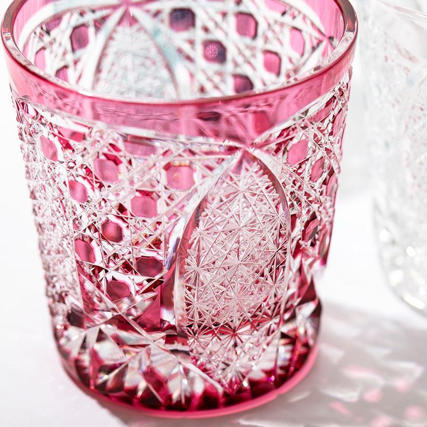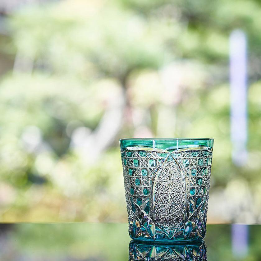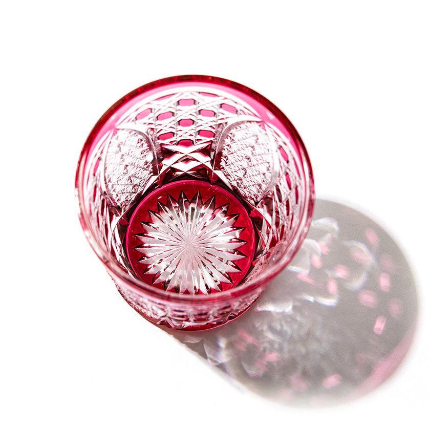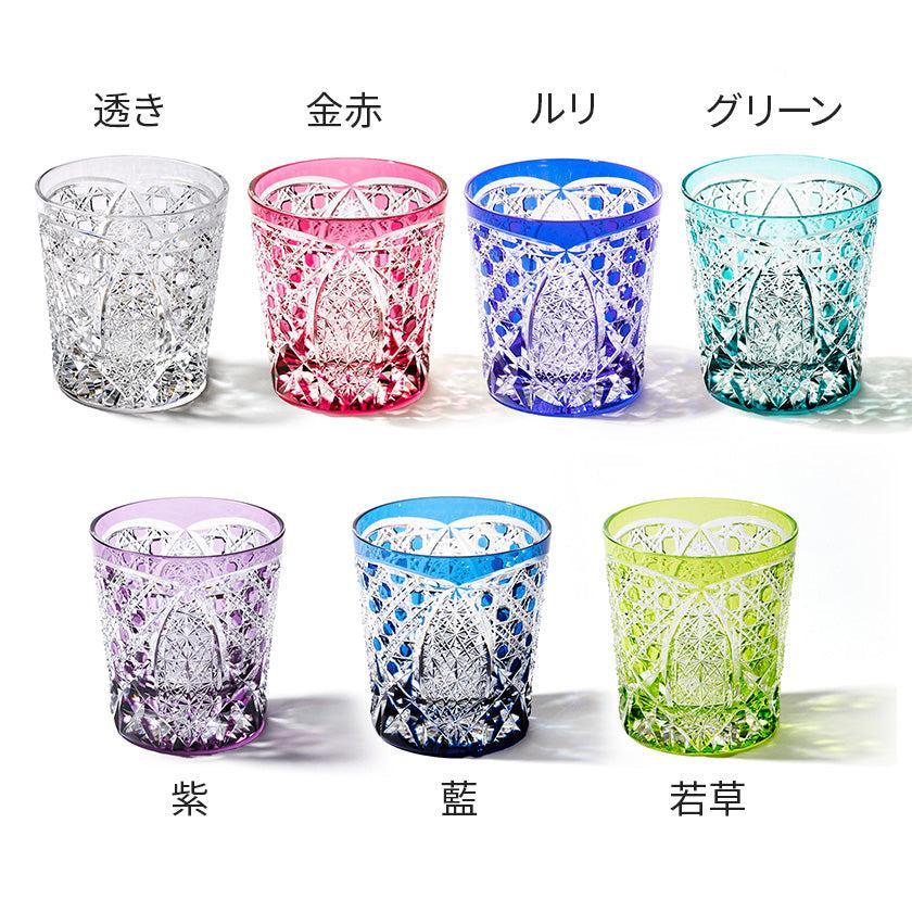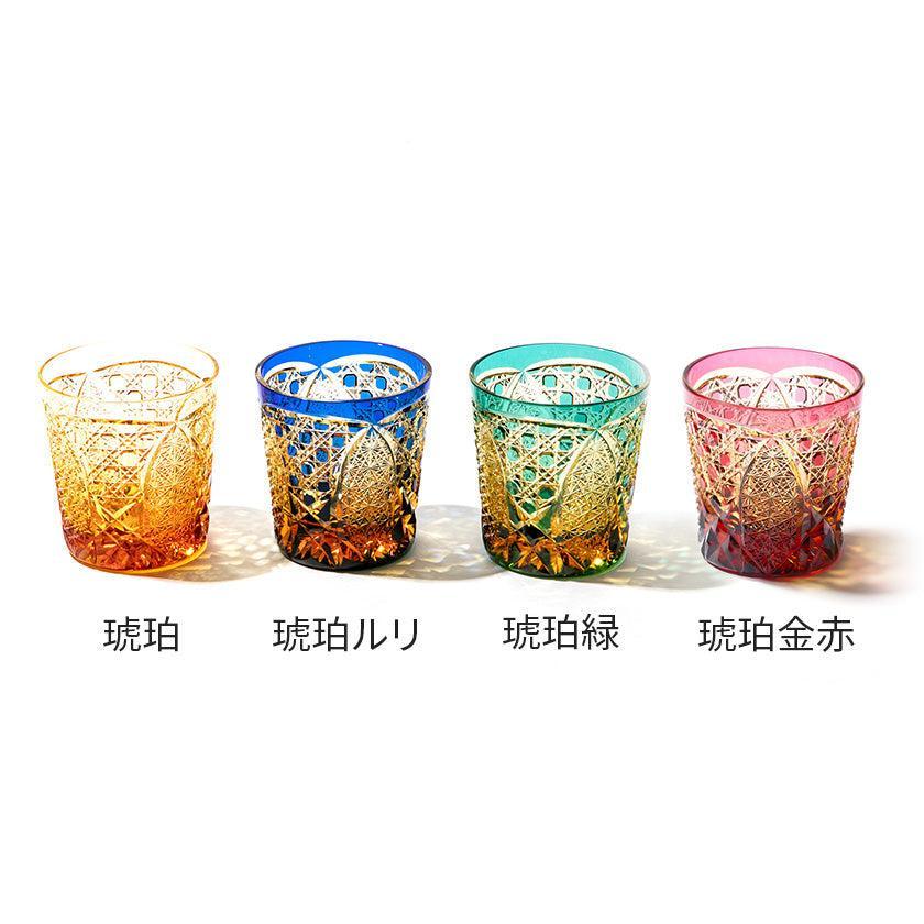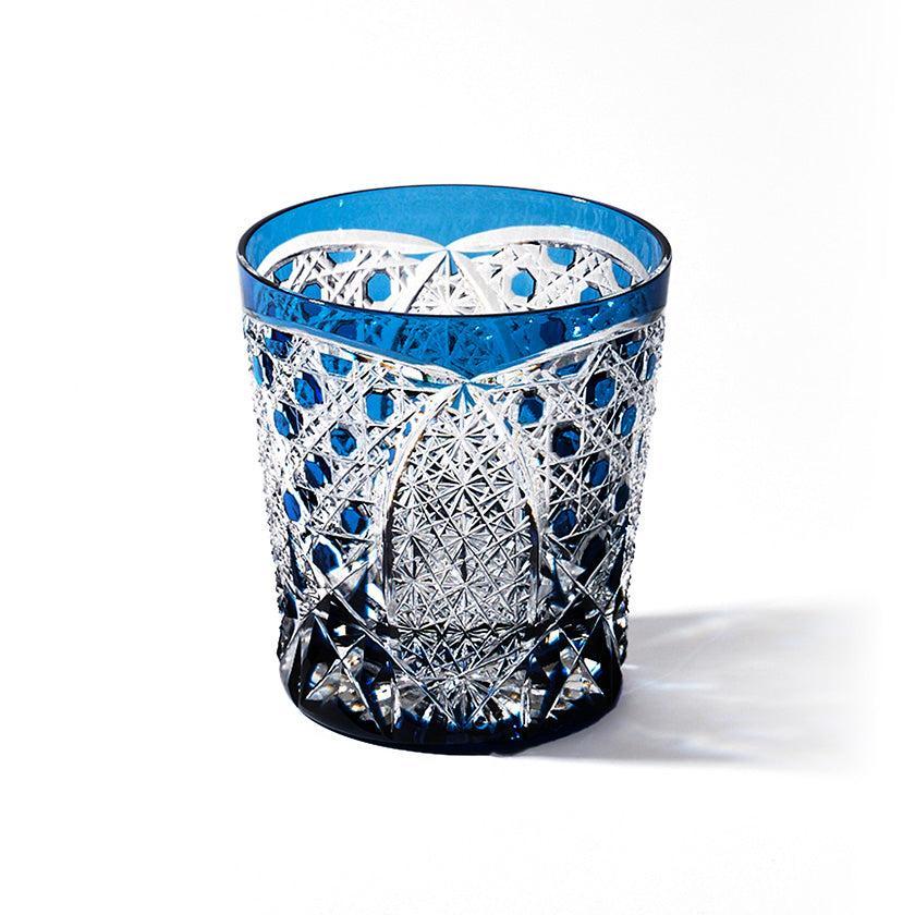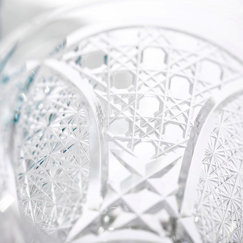 籠の目を図案化し、古来より魔除けとされた「籠目紋」、 不老長寿を表す菊花が連なり咲き誇る様を表す「菊繋ぎ紋」。 二種類の紋様を交互に配した縁起の良い江戸切子です。