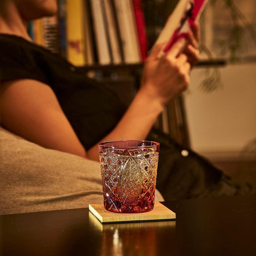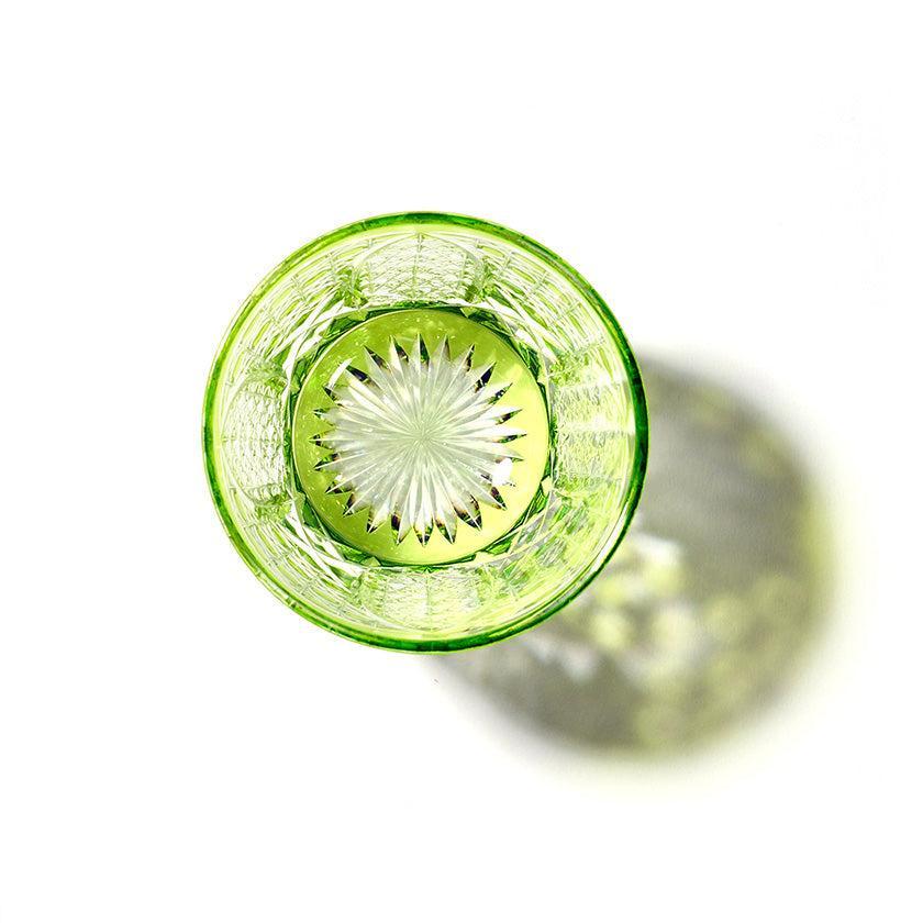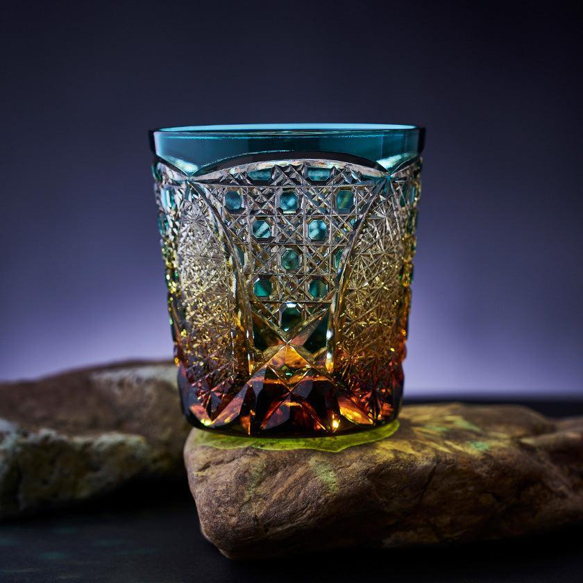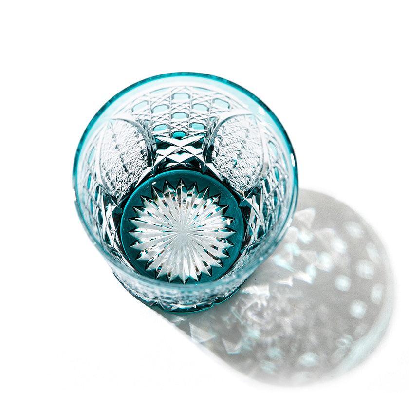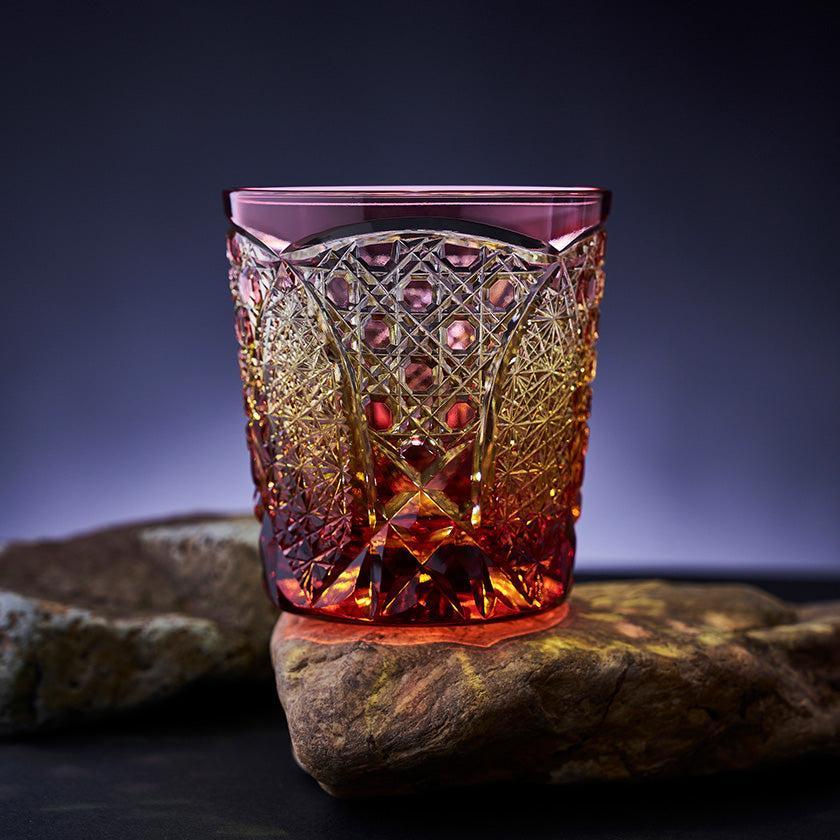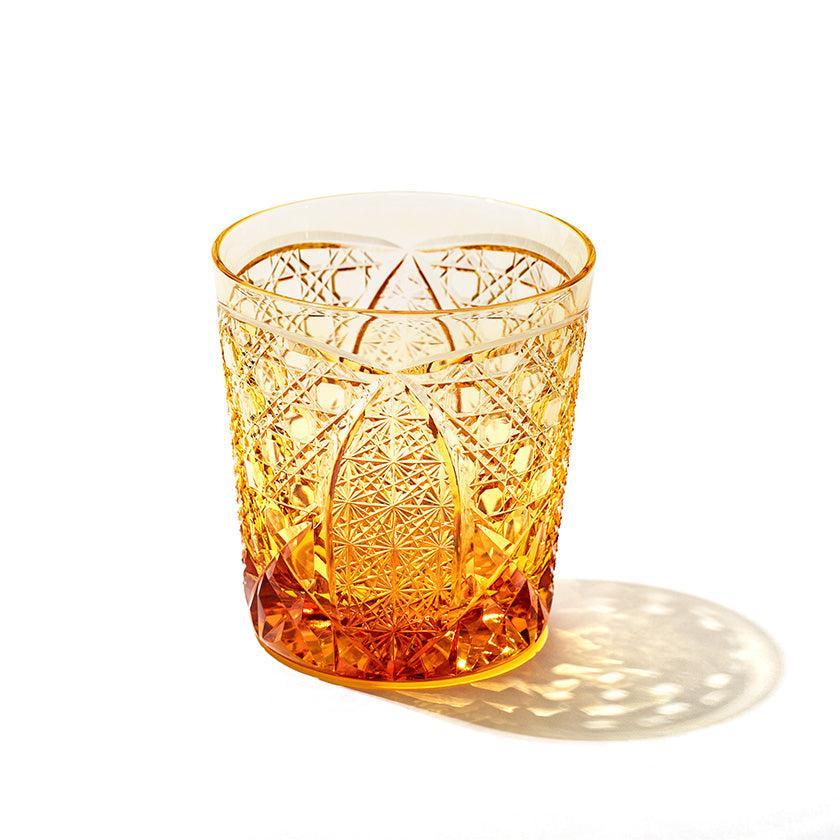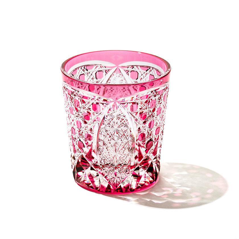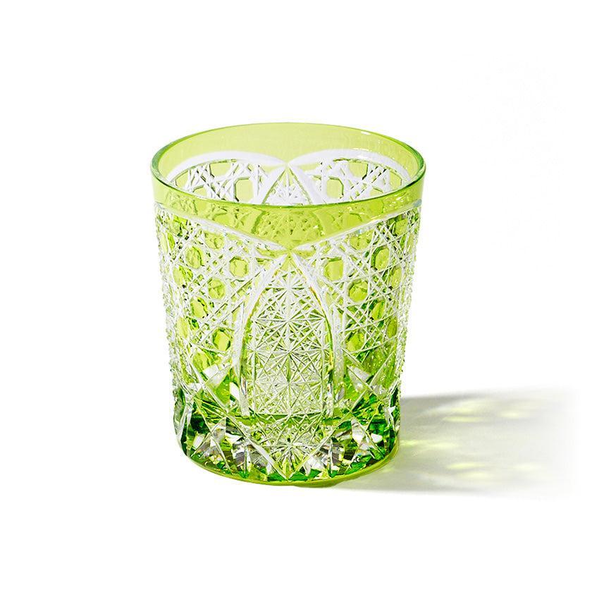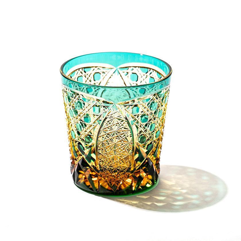 籠の目を図案化し、古来より魔除けとされた「籠目紋」、 不老長寿を表す菊花が連なり咲き誇る様を表す「菊繋ぎ紋」。 二種類の紋様を交互に配した縁起の良い江戸切子です。