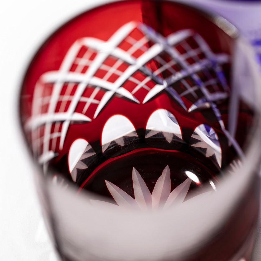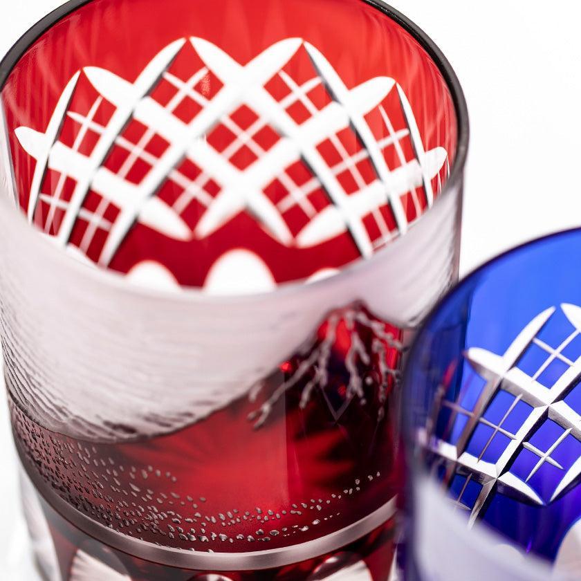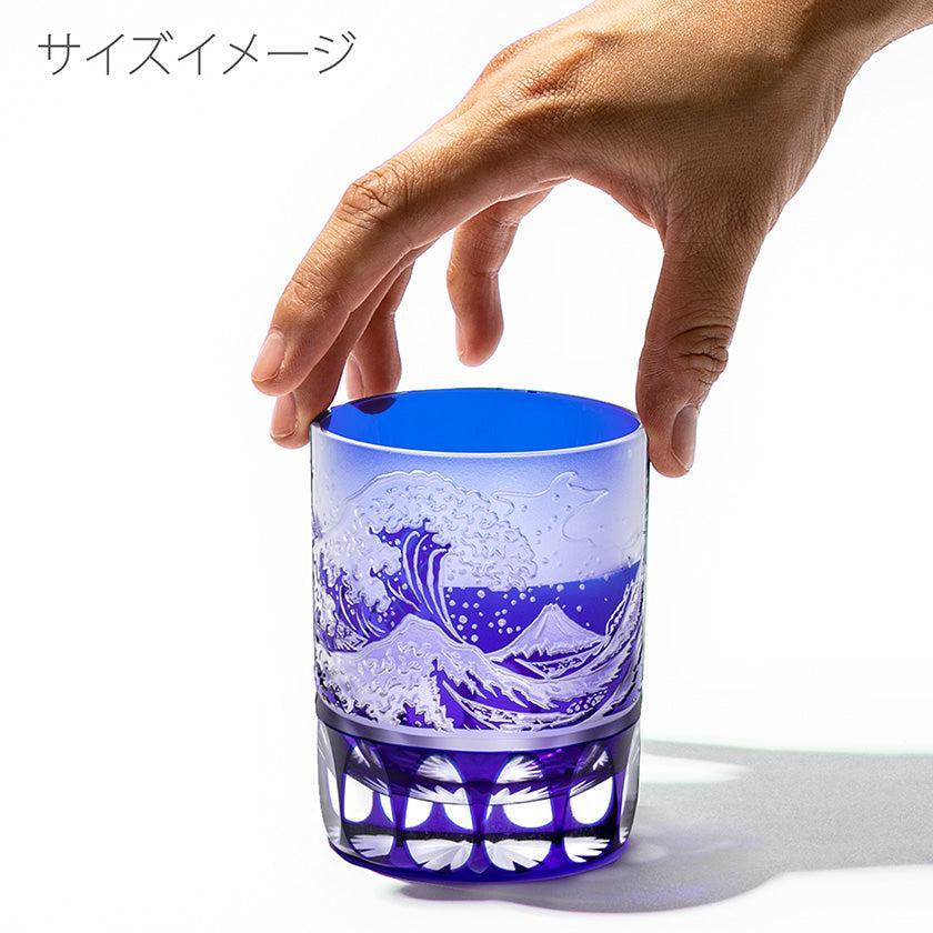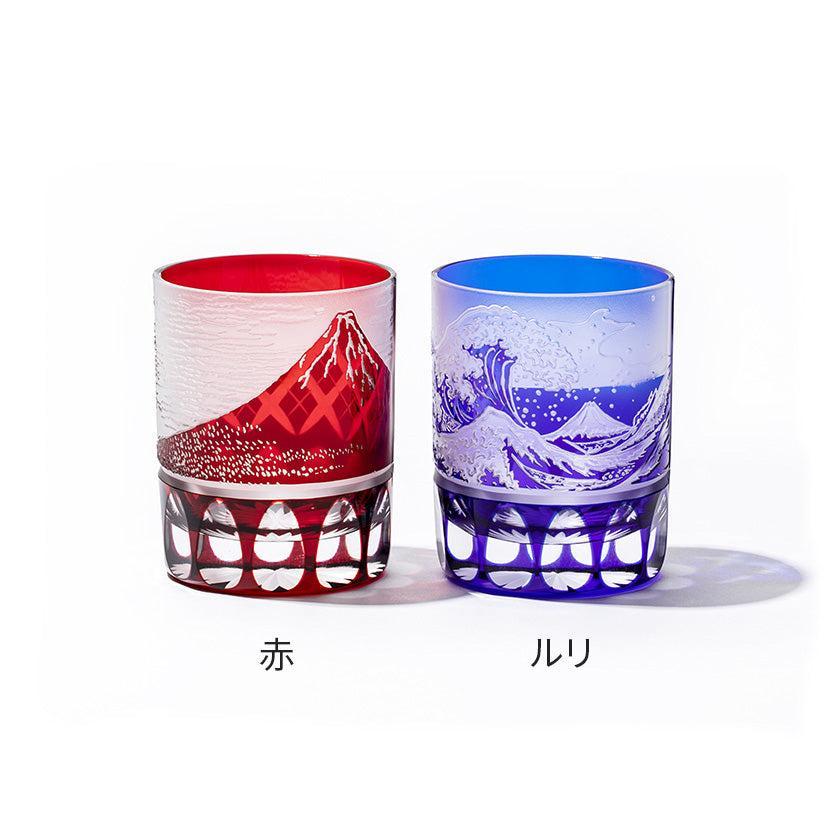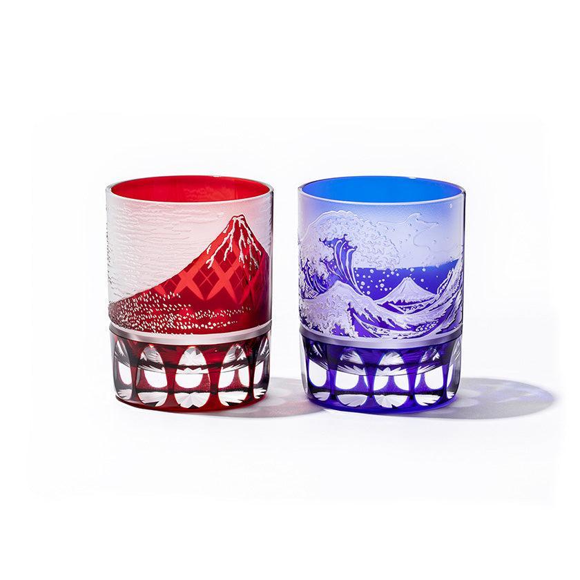葛飾北斎による富嶽三十六景の代表作「凱風快晴」「神奈川沖波裏」をモチーフに、江戸切子の代表的な紋様「矢来紋」を施した 大変縁起の良いこだわりの逸品です。