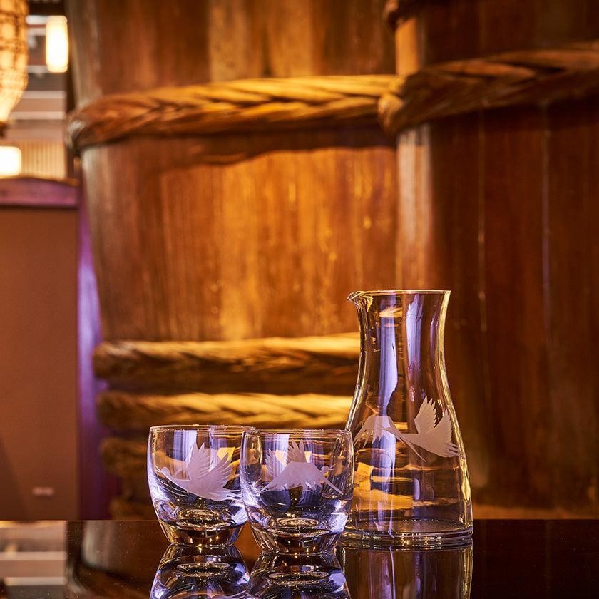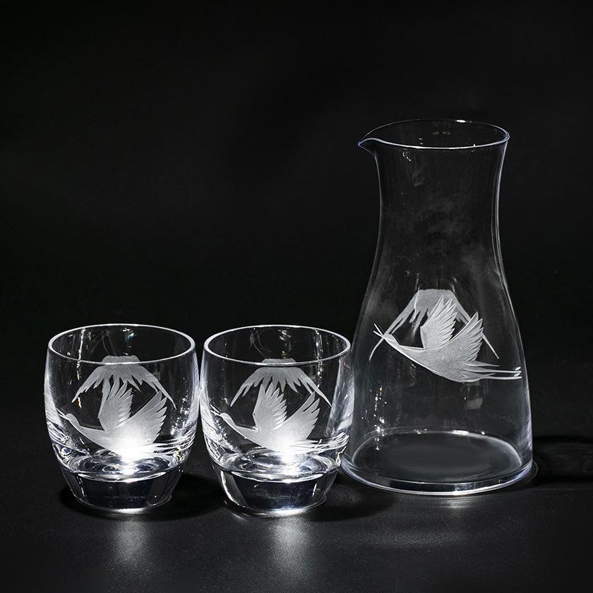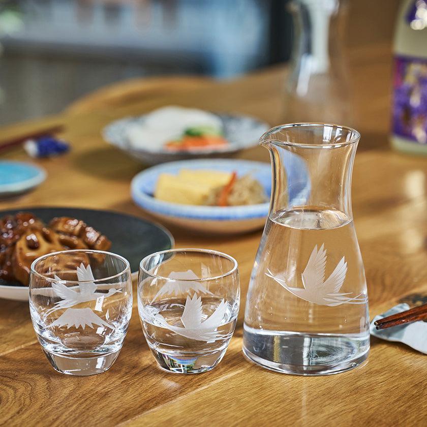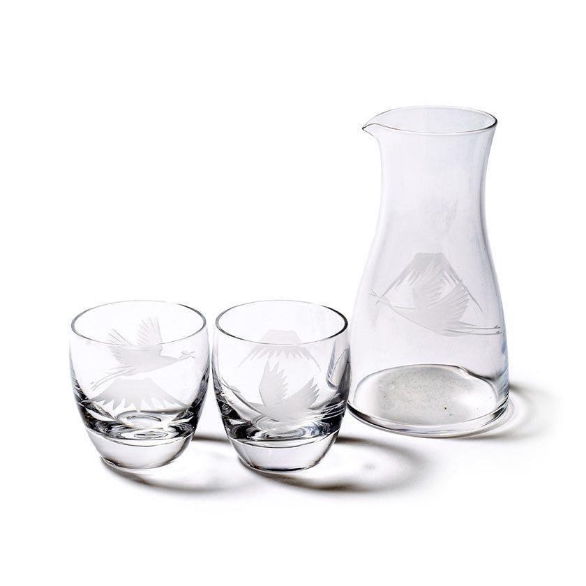 透明のガラスに花切子の技法で縁起の良い富士と鶴をカットしました。日常の様々なシーンに溶け込み、「使いたくなる」シリーズです。