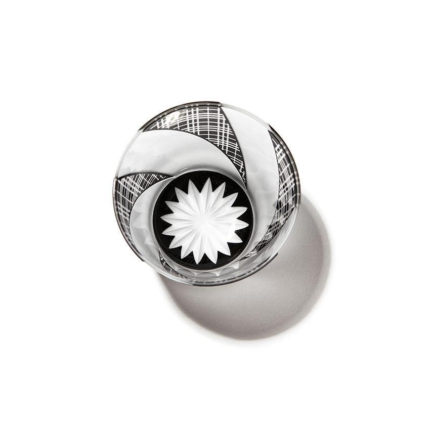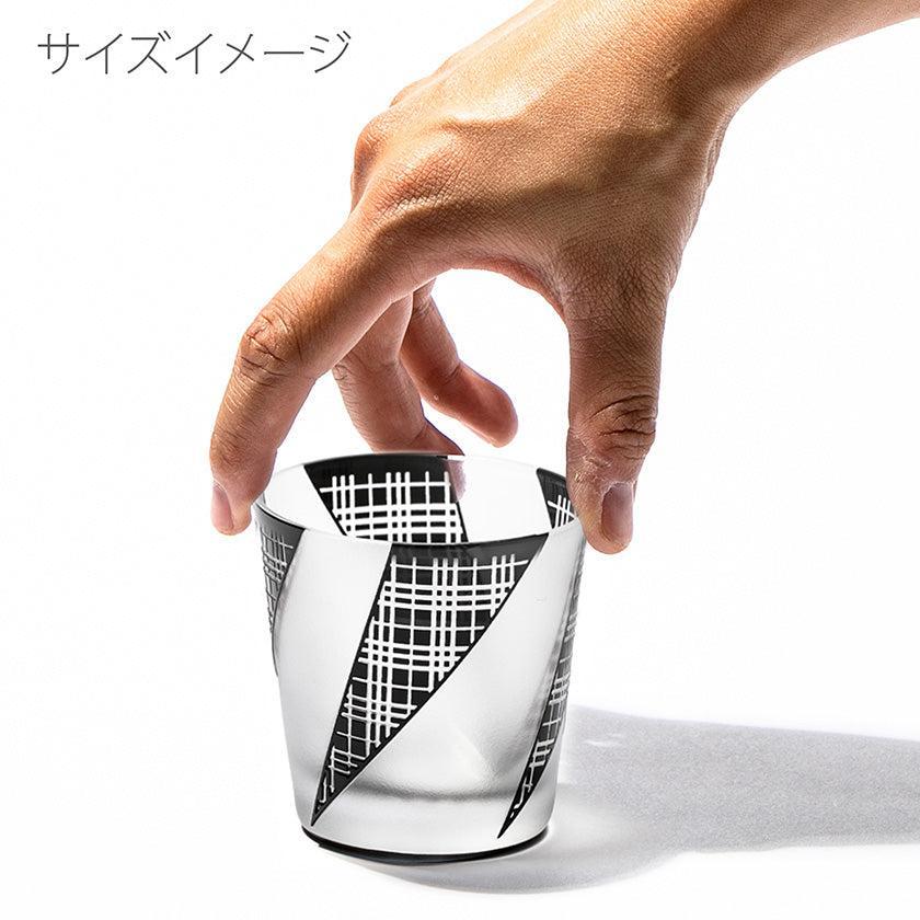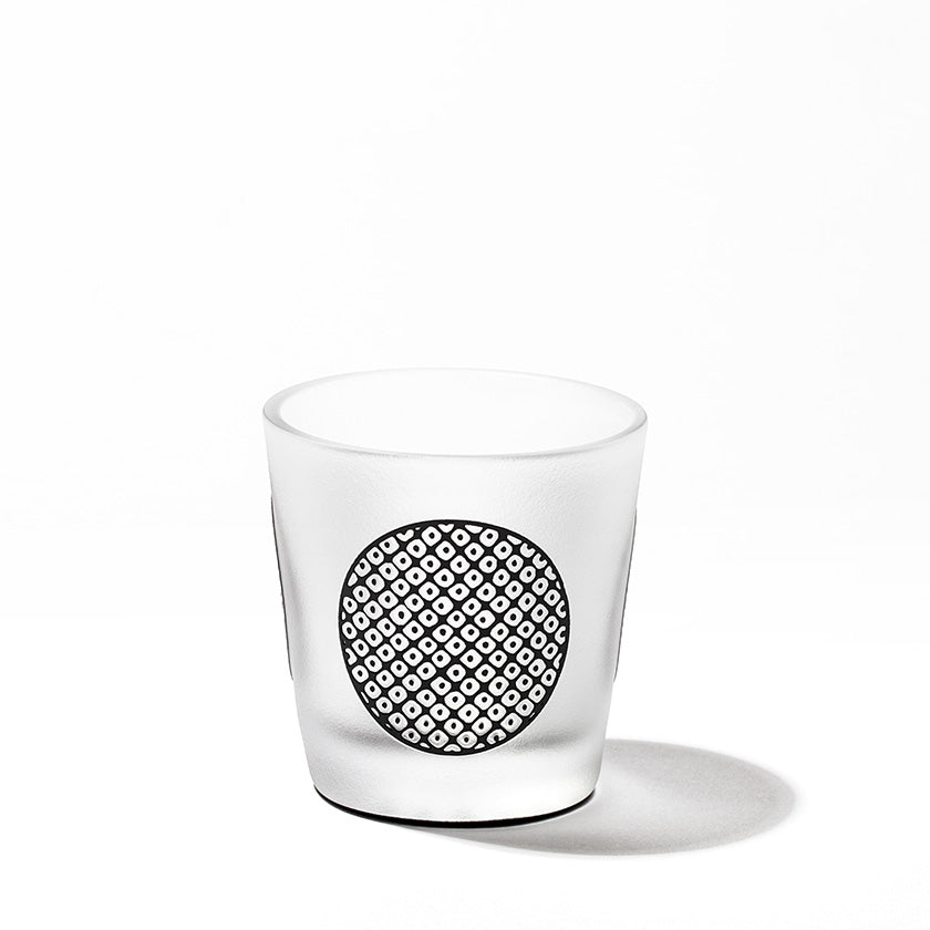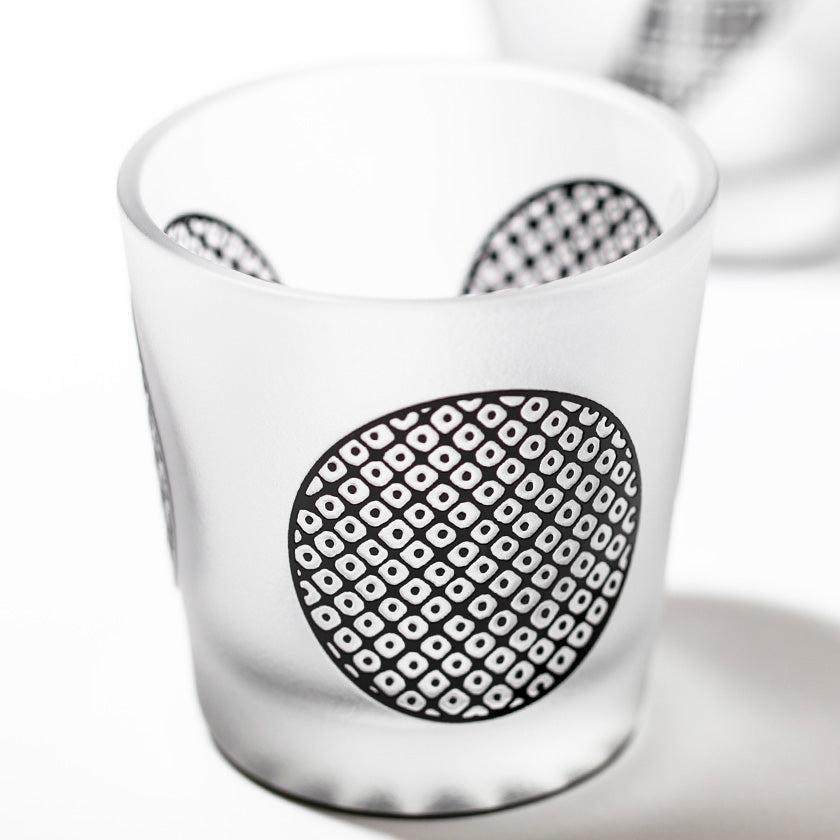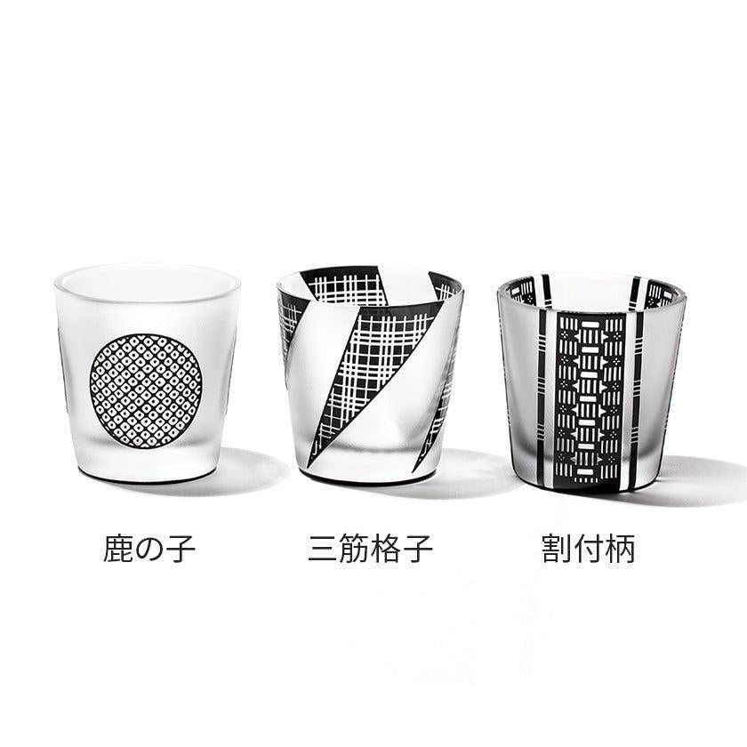 黒小紋は 熟練の職人が手吹きで造り上げた二層構造のガラス器へ 伝統的な江戸小紋「鹿の子」「三筋格子」「割付柄」を彫刻した作品です。江戸小紋の粋で繊細な紋様と落ち着いた黒被せガラスの組み合わせが美しいシリーズです。