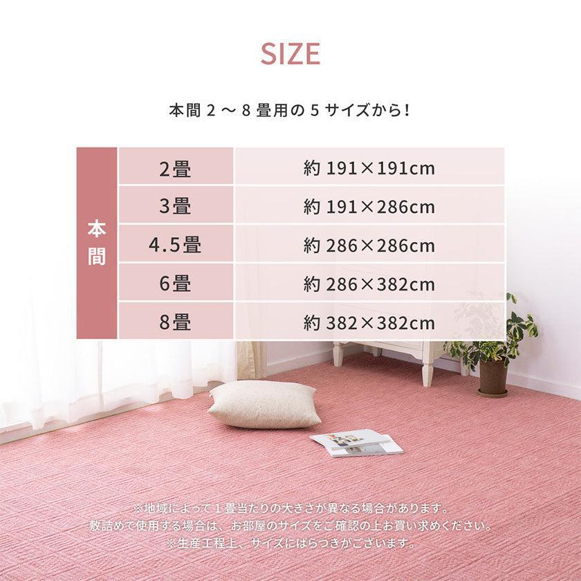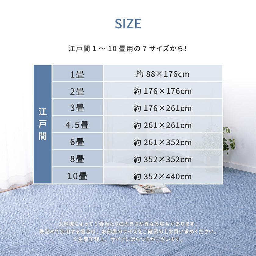 | サイズ (cm) | [江戸間] 1畳: W88 * L176 2畳: W176 * L176 3畳: W176 * L261 4.5畳: W261 * L261 6畳: W261 * L352 8畳: W352 * L352 10畳: W352 * L440 [本間] 2畳: W191 * L191 3畳: W191 * L286 4.5畳: W286 * L286 6畳: W286 * L382 8畳: W382 * L382 |