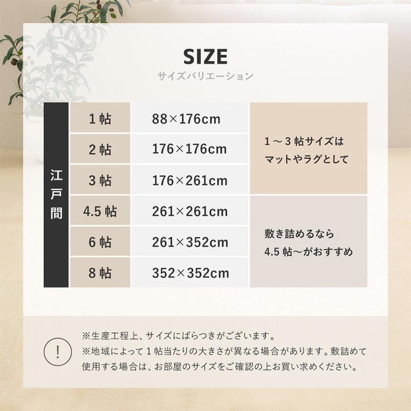 | サイズ (cm) | [江戸間] 1畳: W88 * L176 2畳: W176 * L176 3畳: W176 * L261 4.5畳: W261 * L261 6畳: W261 * L352 8畳: W352 * L352 |