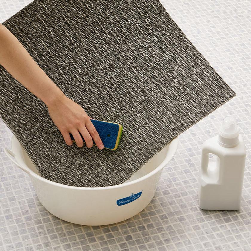 正方形のマットを組み合わせたタイルカーペットは、汚れた部分だけ取り外して洗うことができるのも便利です。